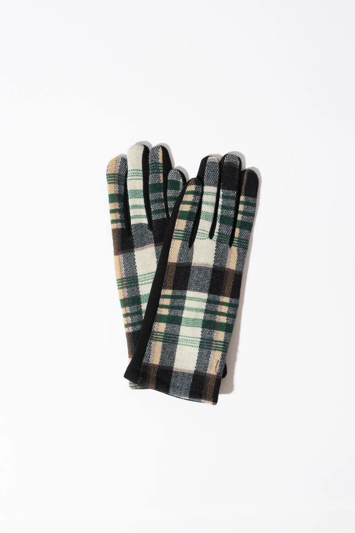 Sophisticated green plaid gloves featuring an elegant check pattern. Strategically placed embroidery on the thumb and fingertip enables touchscreen functionality, allowing seamless mobile device operation without removal. The precision engineering maintains both warmth and digital accessibility.