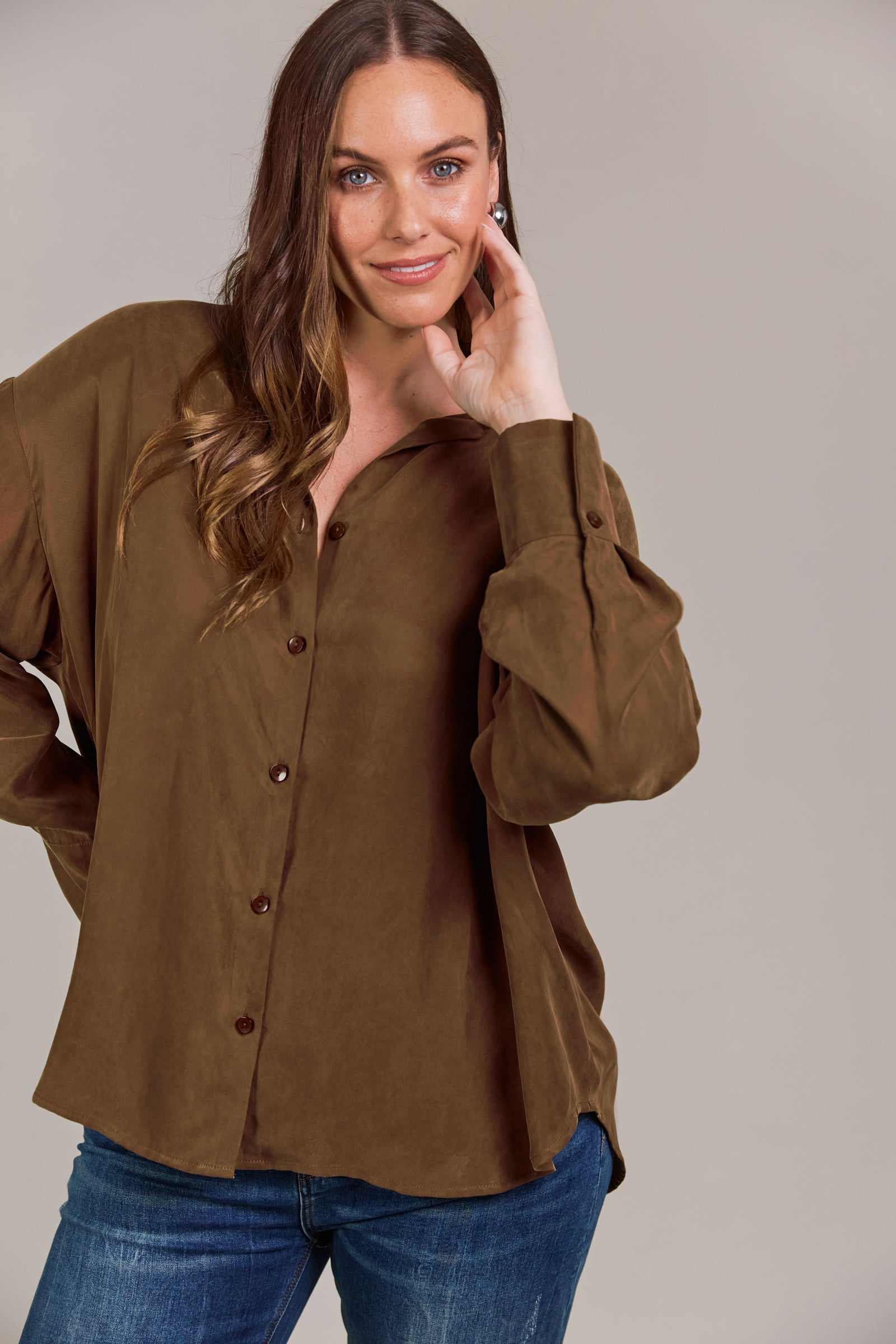 Expertly crafted from a blend of 60% cupro and 40% viscose, the Eden Shirt in Tobacco is a must-have addition to any wardrobe. With a versatile button-down design and a loose fit, this shirt offers both style and comfort. Its modern features, including a drop shoulder and curved high-low hem, elevate it to a fashion-forward staple. Available in XS to XL.