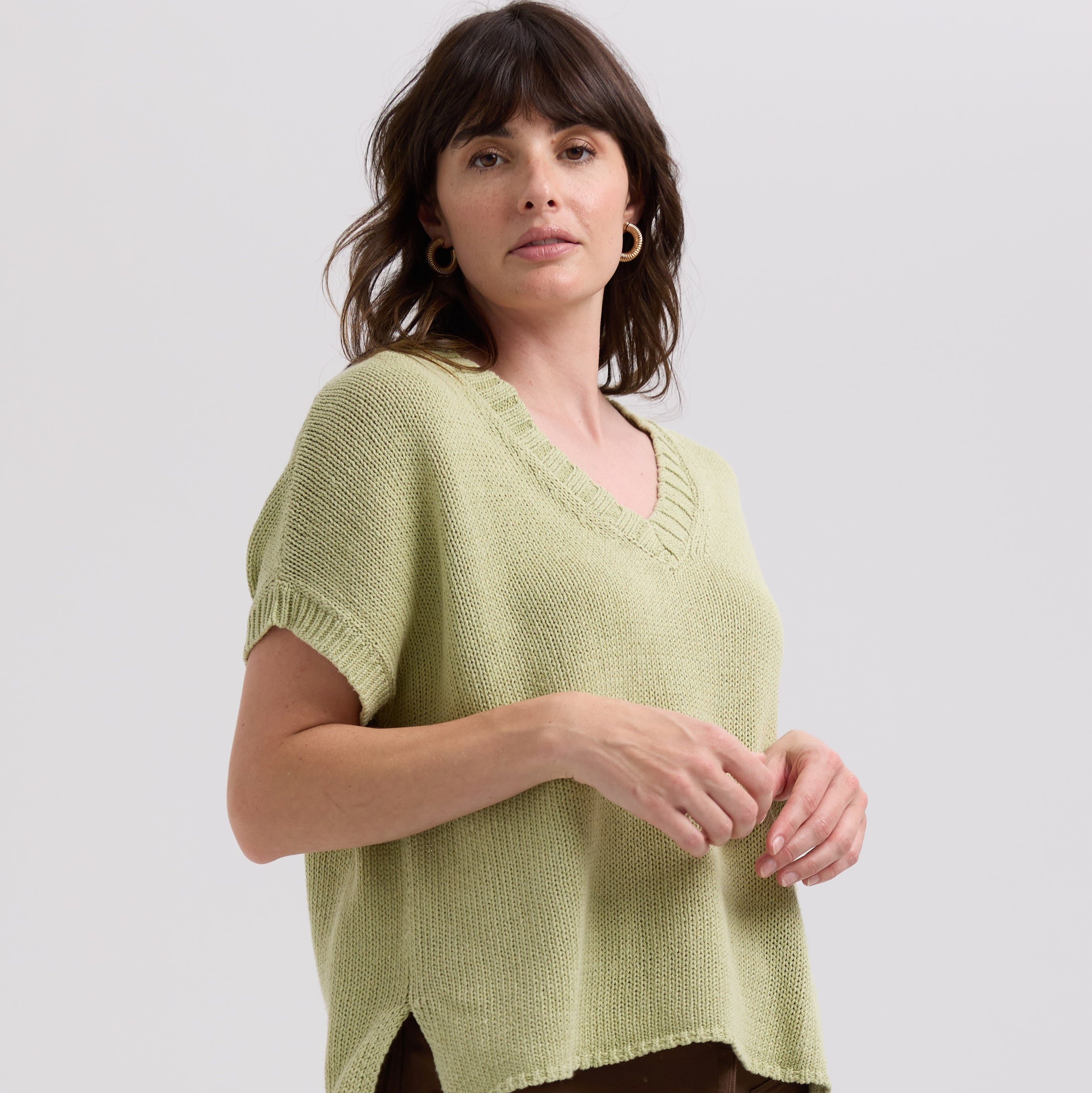 This adaptable knit top from LD & Co, in a striking Lemongrass hue, complements shorts, pants, or your preferred skirt with ease. It offers short sleeves, a V-neckline, and a relaxed boxy fit, made from a textured linen blend perfect for summer.