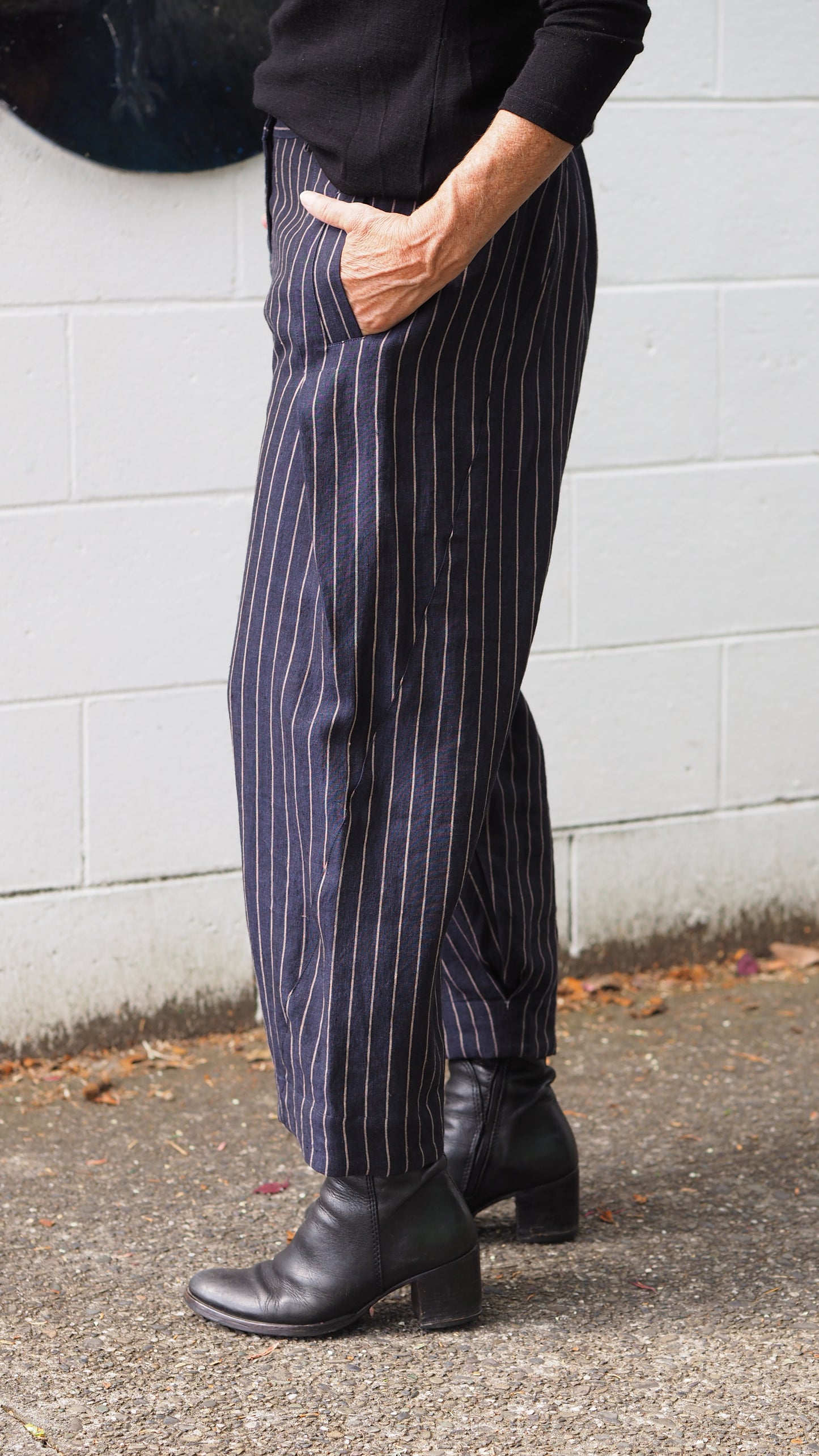 The Maple Pant offers a high-waisted, linen design that prioritizes comfort and style. Depending on your height, these pants fall at either 4/5 length or full length. They feature a partially elasticated waistband complemented by a front button closure. The front and lower leg tucks create a relaxed yet refined silhouette. Choose from two sophisticated colours: Forest Green and Navy Stripe.