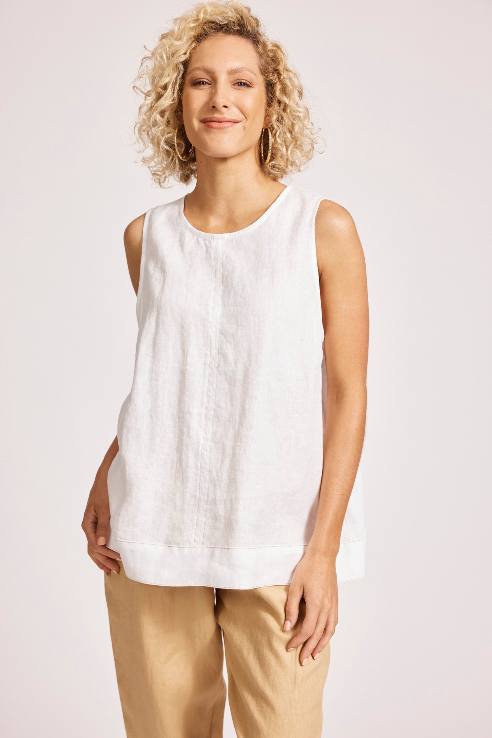 A relaxed linen tank with refined detailing. Crafted from 100% linen for breathable comfort. Features exposed shoulders, contrast decorative topstitching, button closure at the back neck, wide cuffed hem, and soft A-line silhouette.