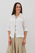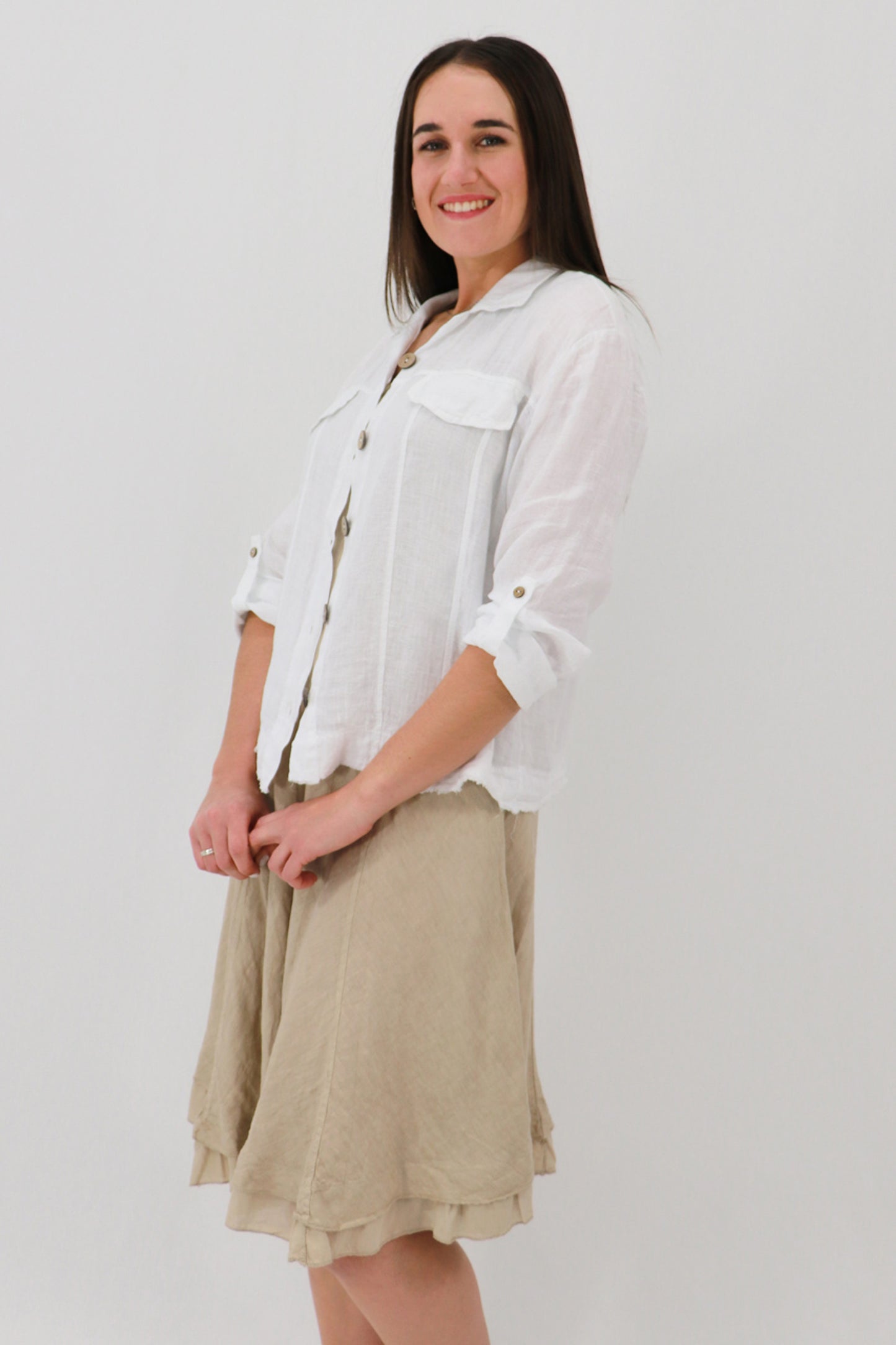 This classy style can be worn as either a shirt or a jacket. It has lovely panel detailing to offer a flattering shape, finished with coconut buttons and a raw edge. This is a versatile piece, perfect for taking your wardrobe from one season to the next.