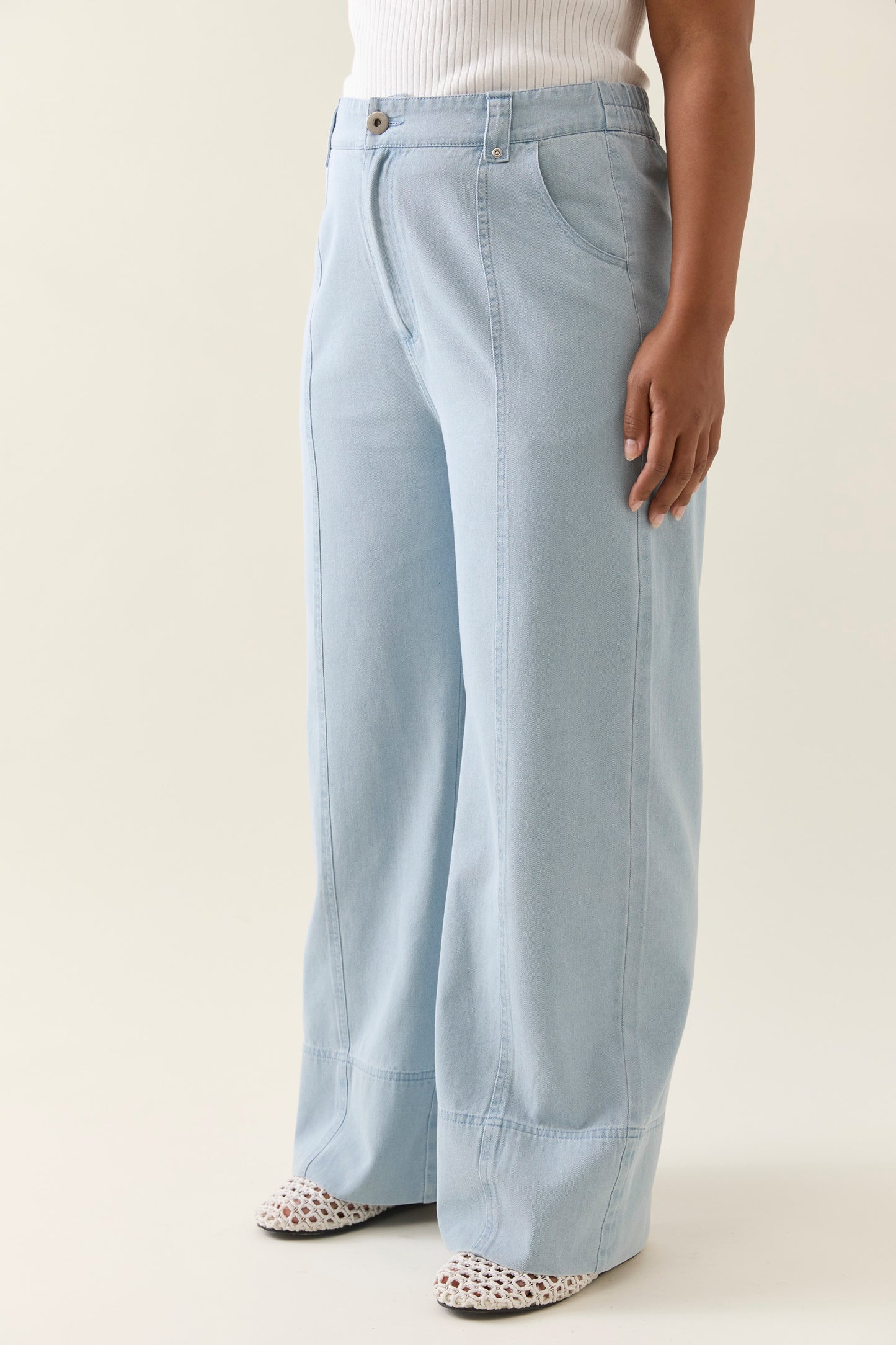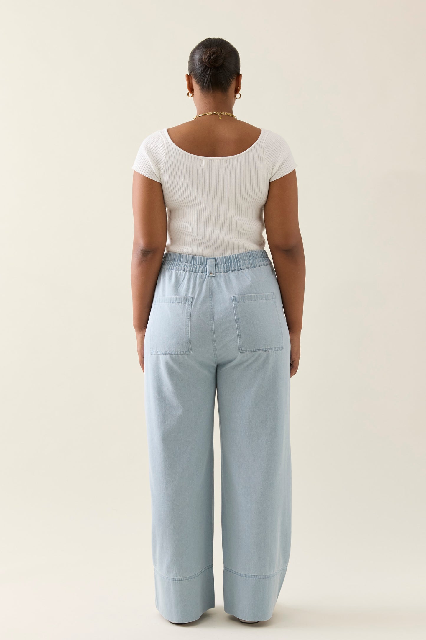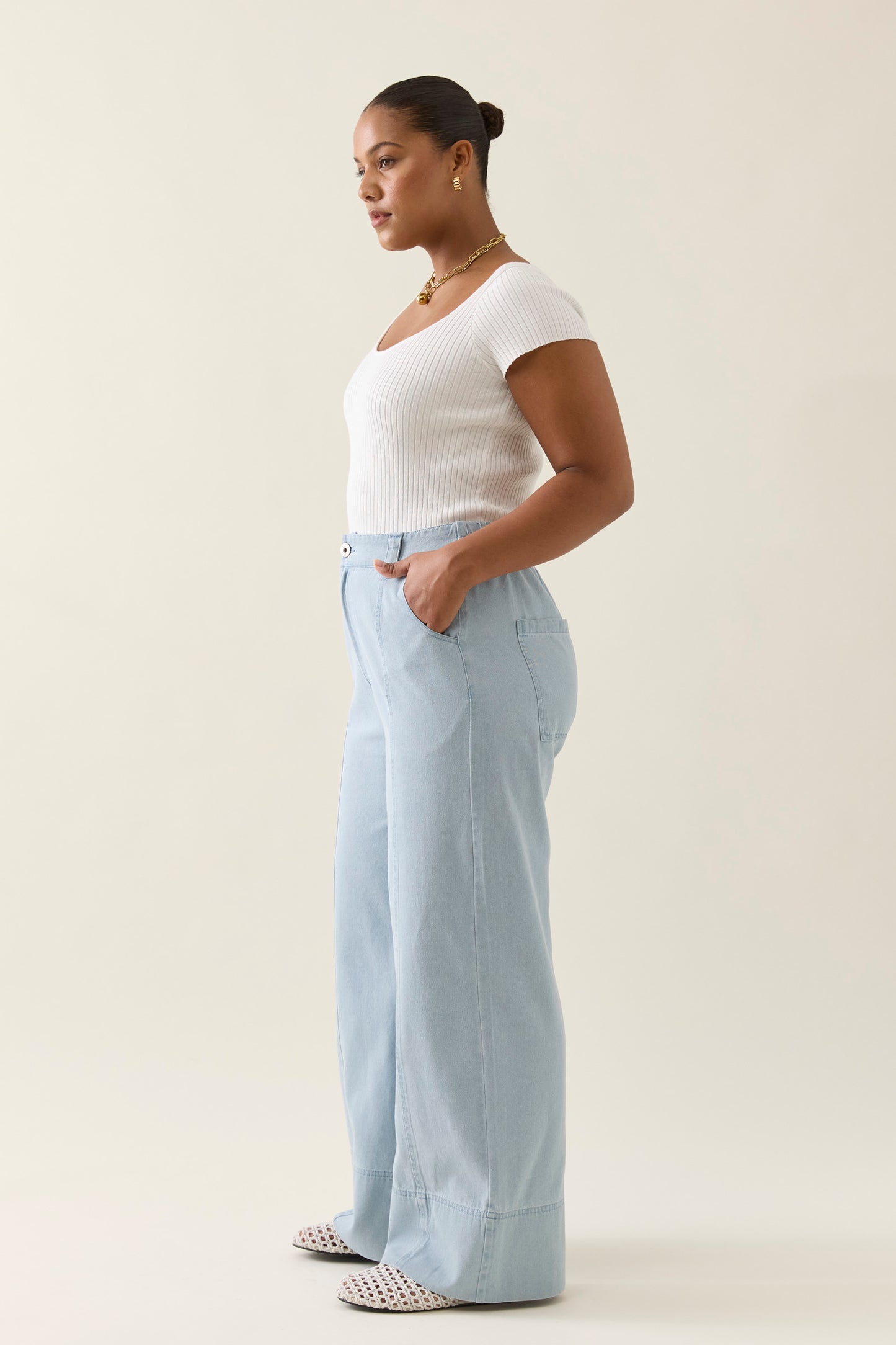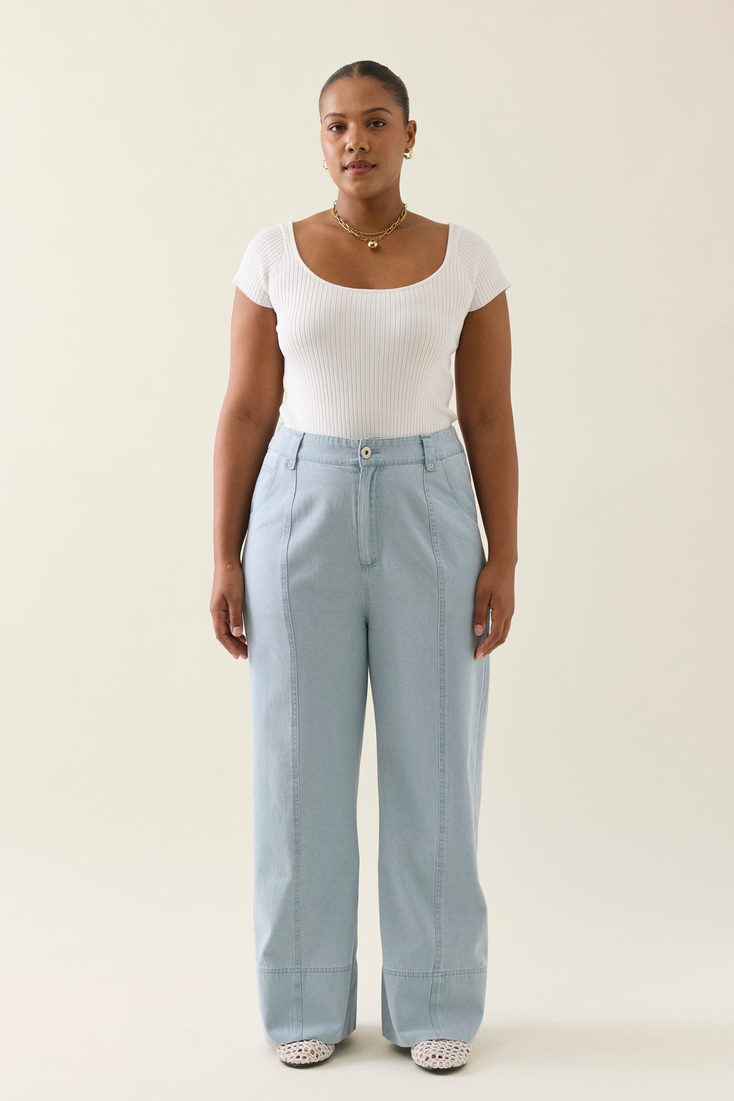 A full-length pant that balances ease with everyday elegance. Crafted from lightweight non-stretch denim, this style features topstitched front seams, a zip fly with an elasticated back waistband, and a wide hem finish for a flattering silhouette.