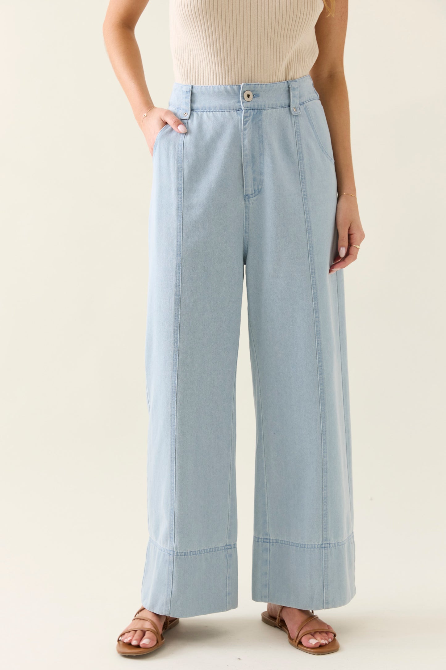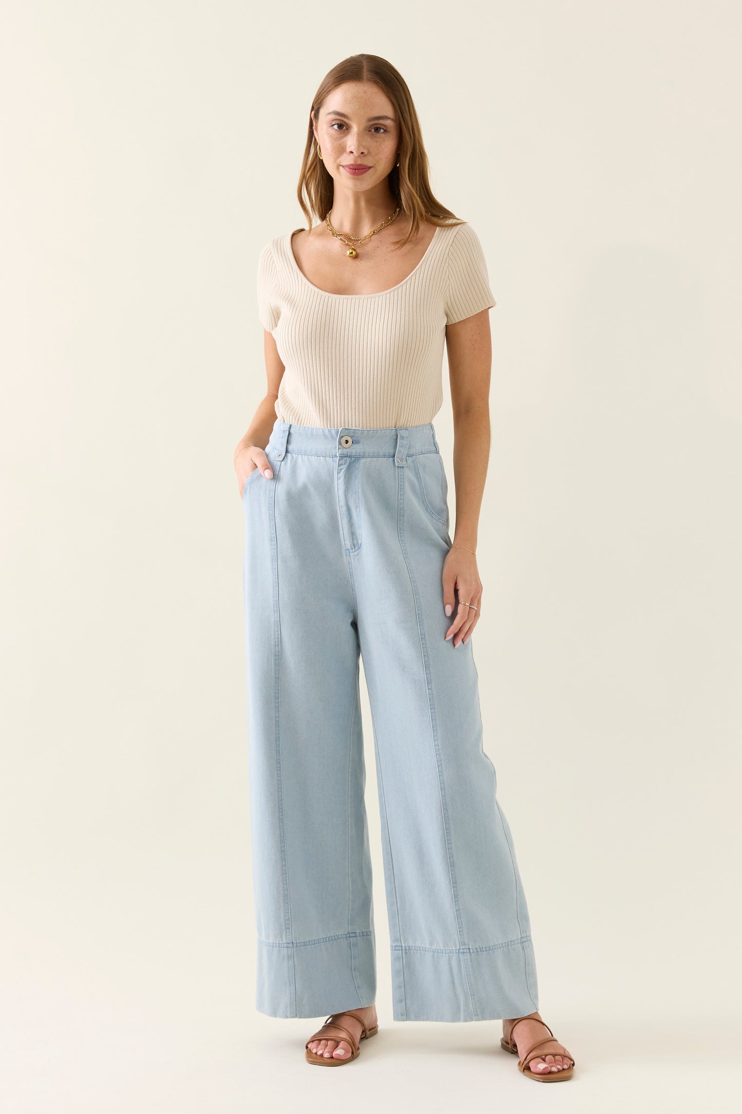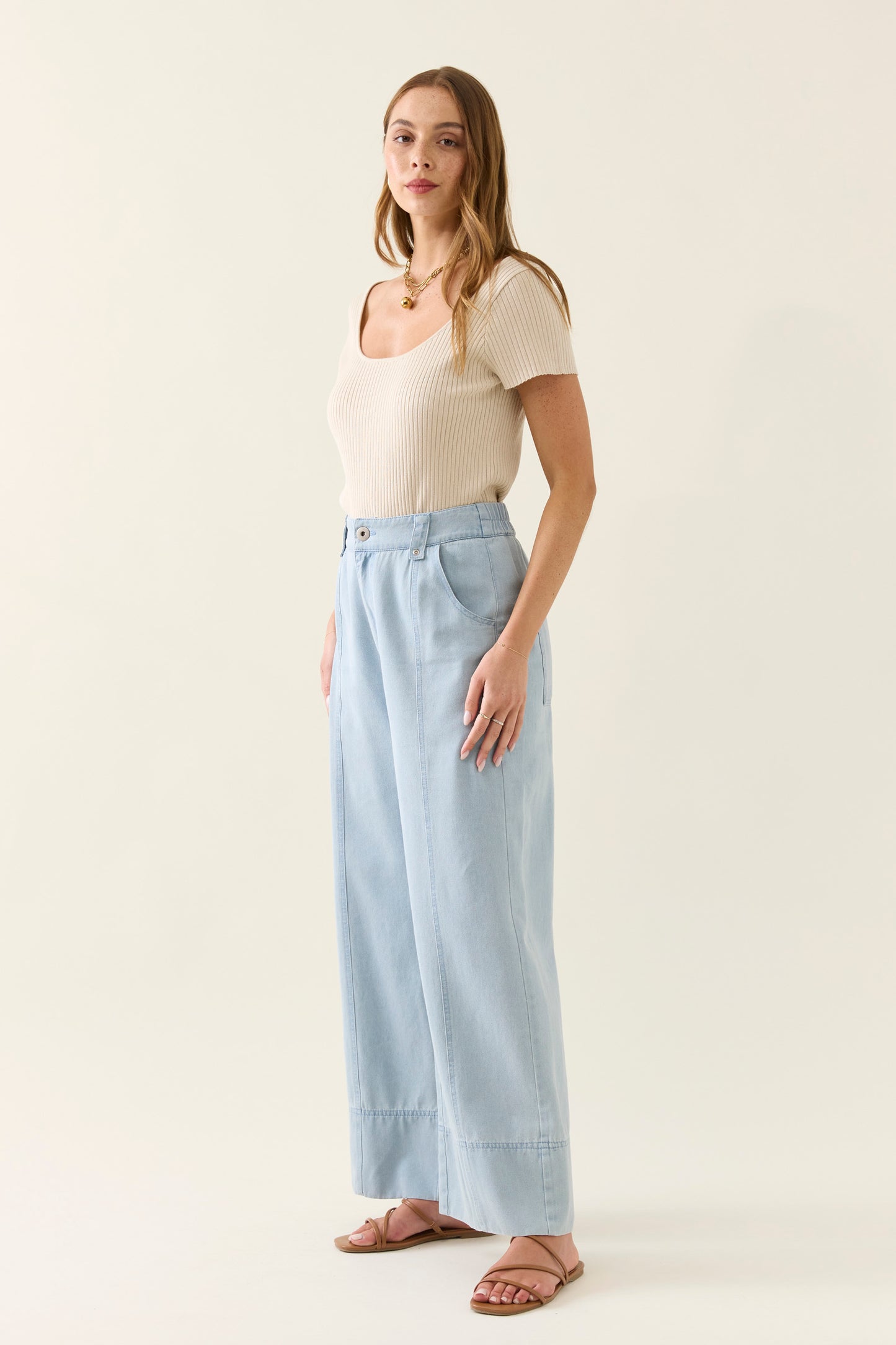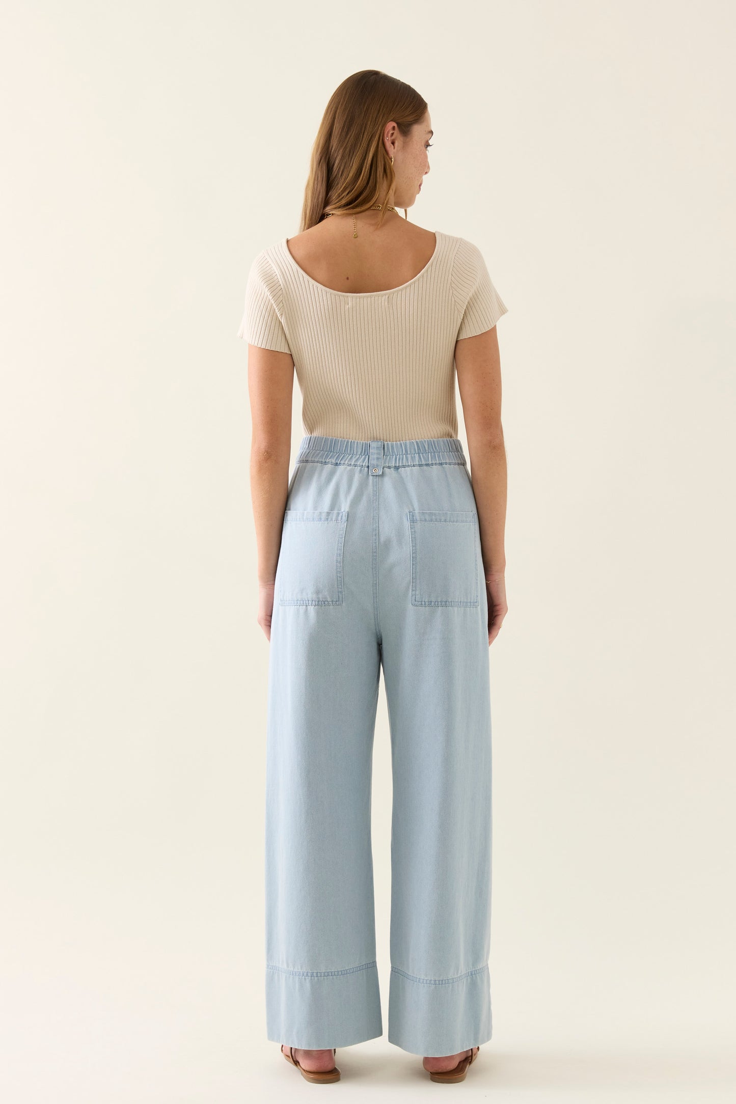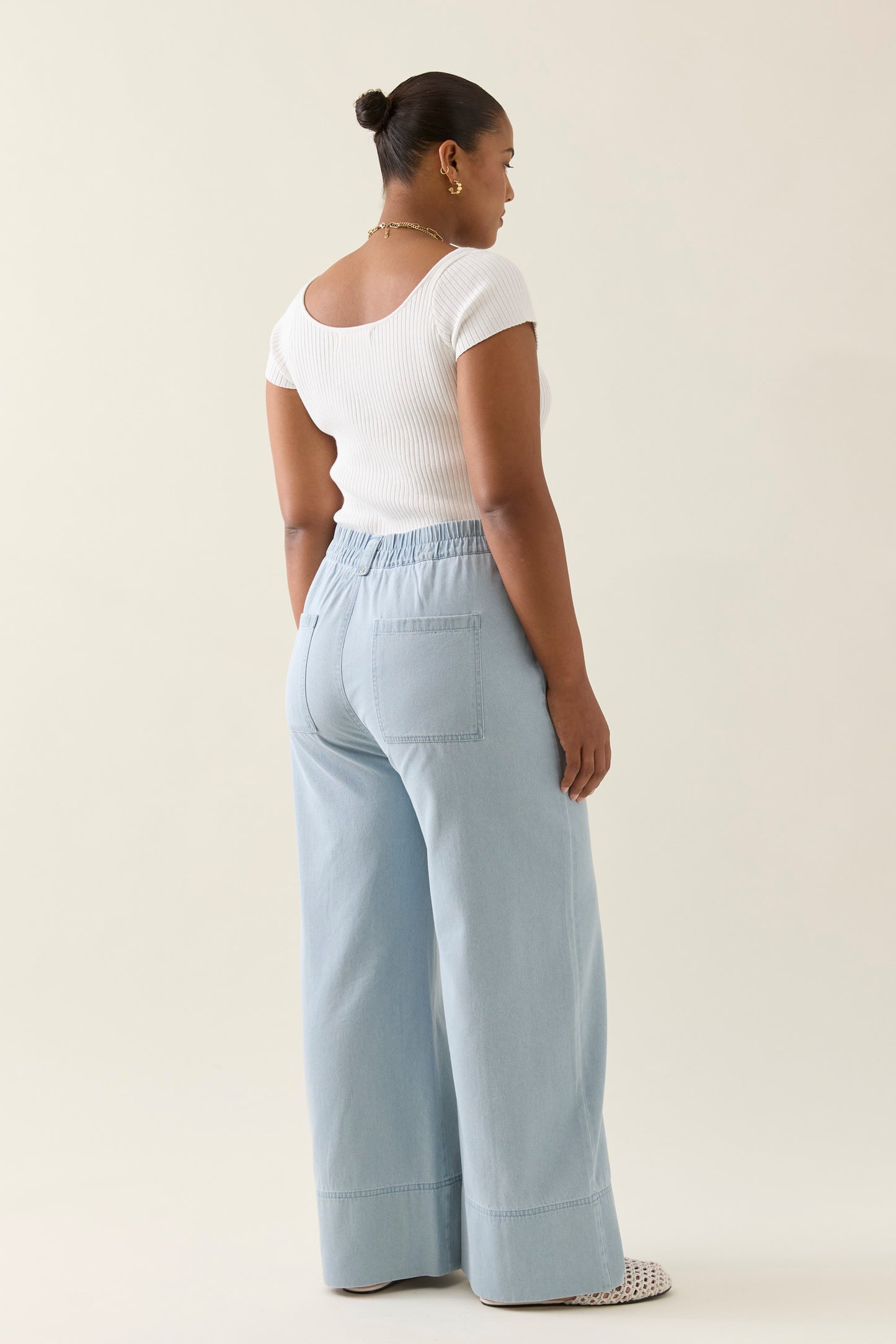 A full-length pant that balances ease with everyday elegance. Crafted from lightweight non-stretch denim, this style features topstitched front seams, a zip fly with an elasticated back waistband, and a wide hem finish for a flattering silhouette.