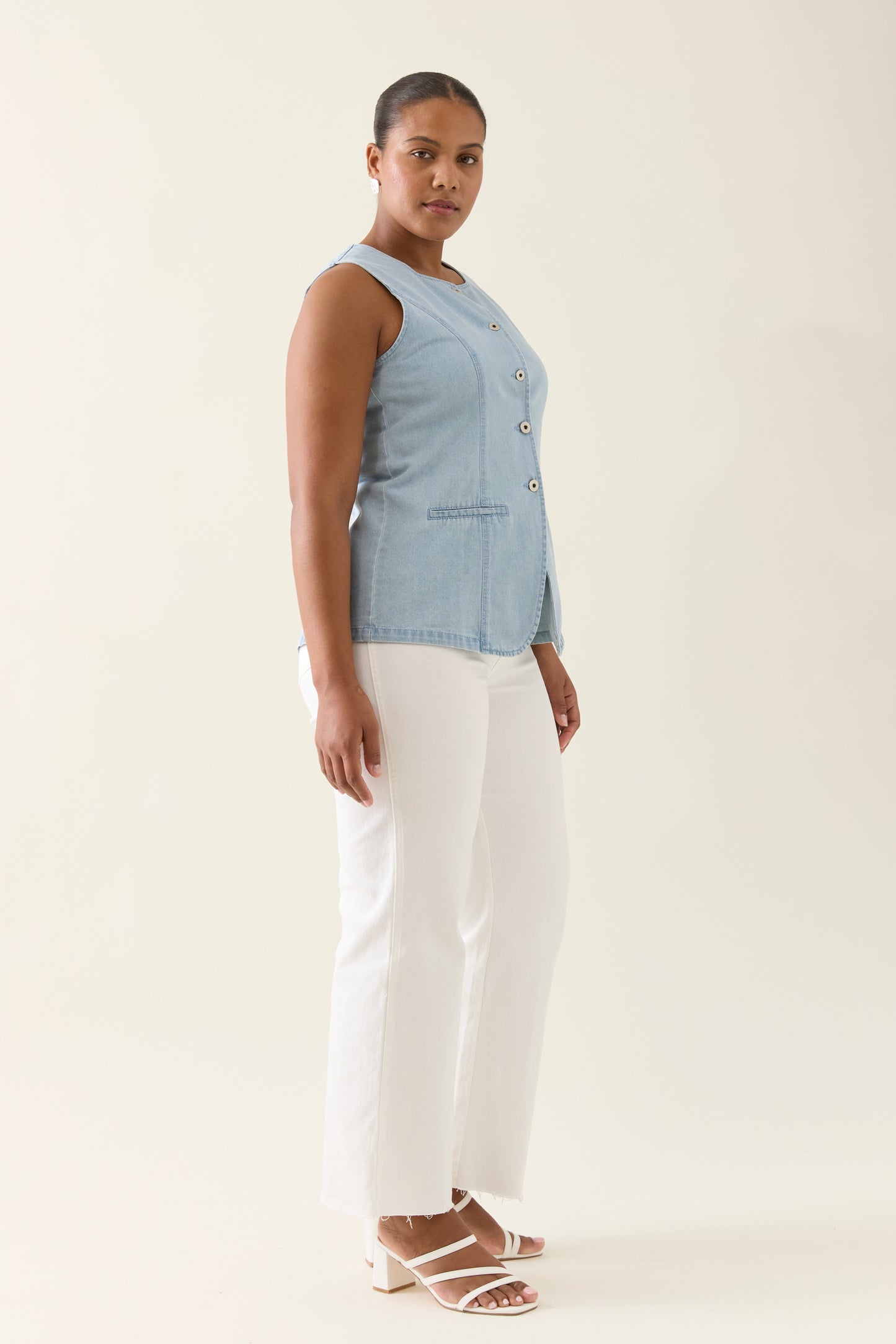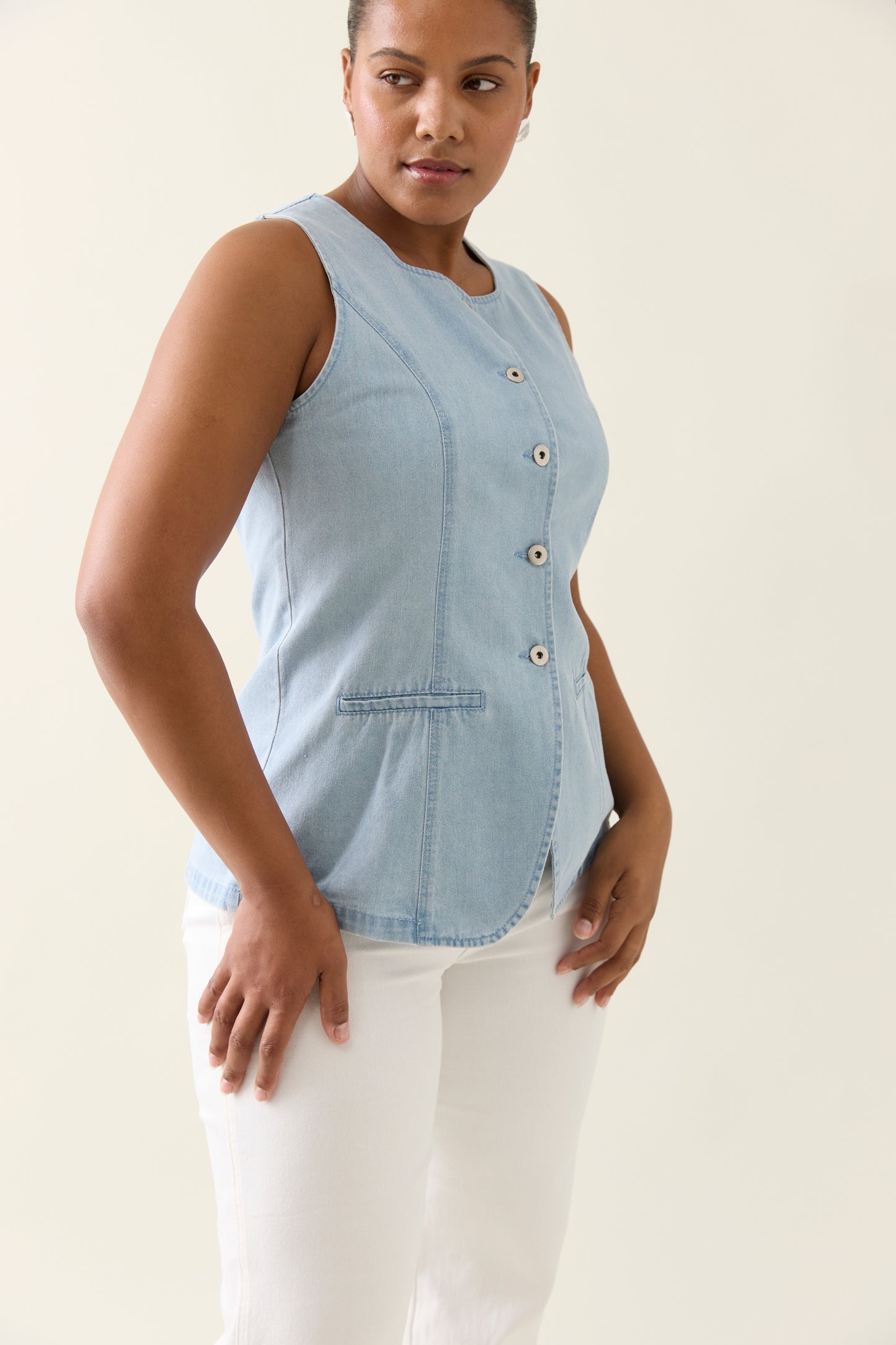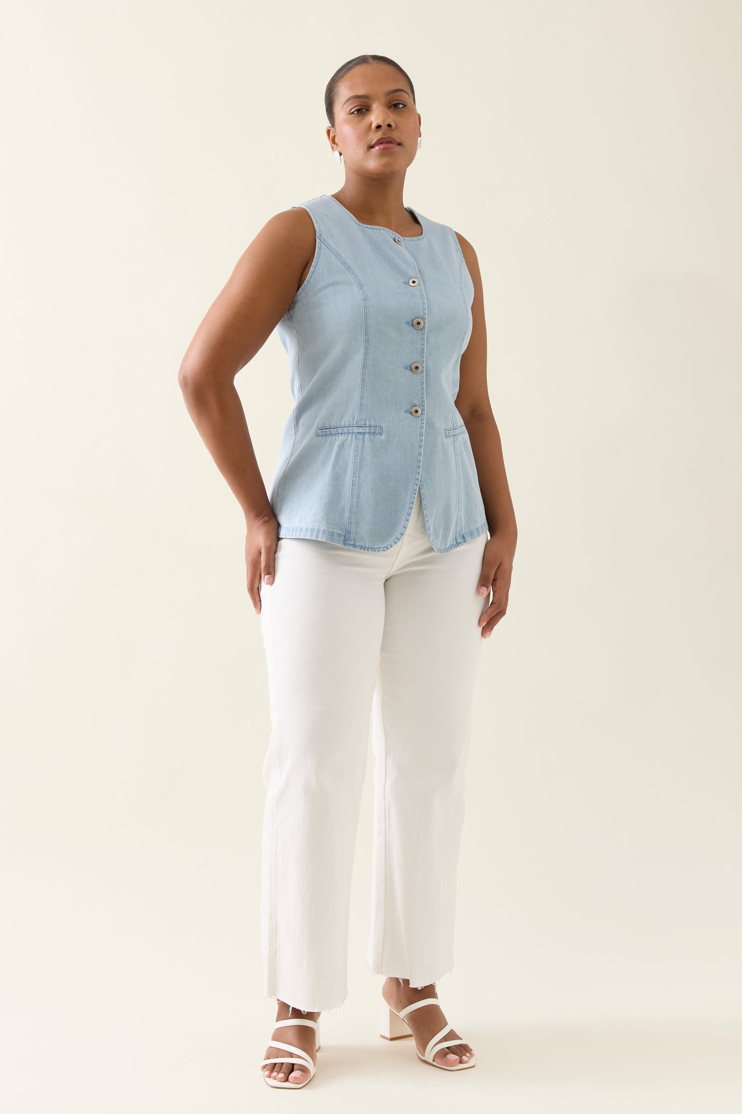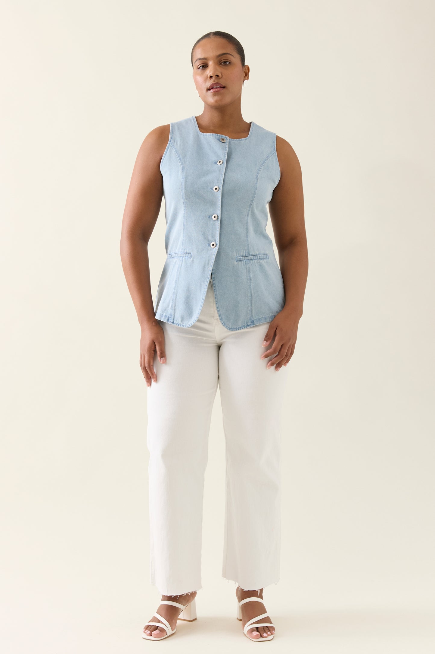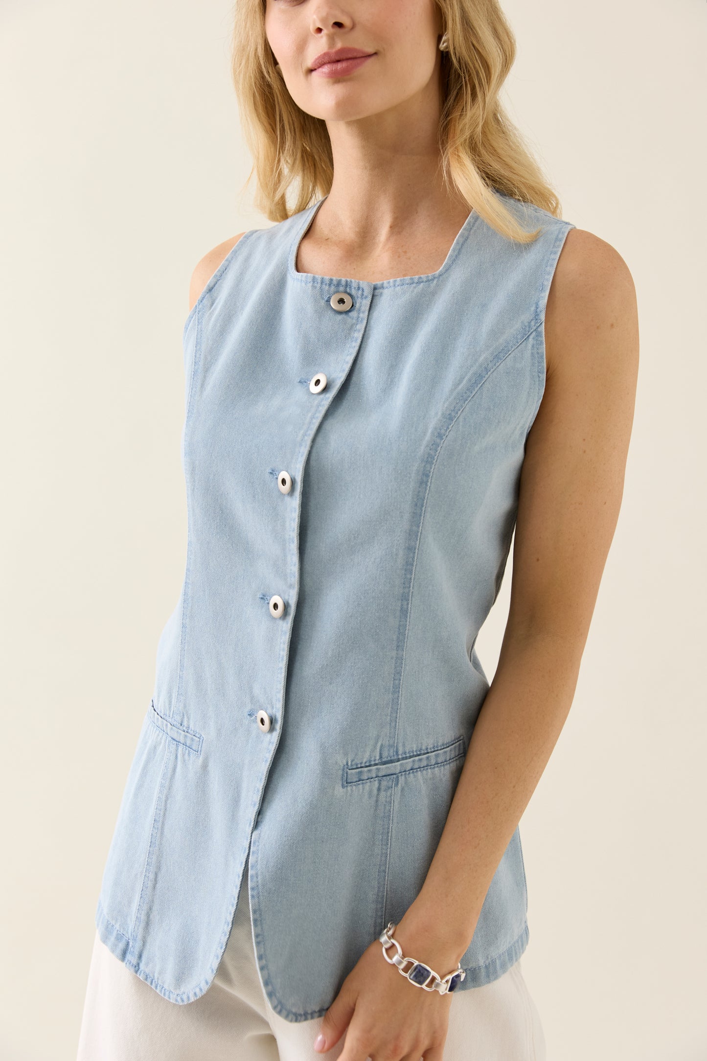 Tailored for a flattering silhouette, the Sofie Denim Vest is crafted from lightweight 100% cotton denim. Features a high square neckline, shaped panel seams, button-through front and faux welt pockets.