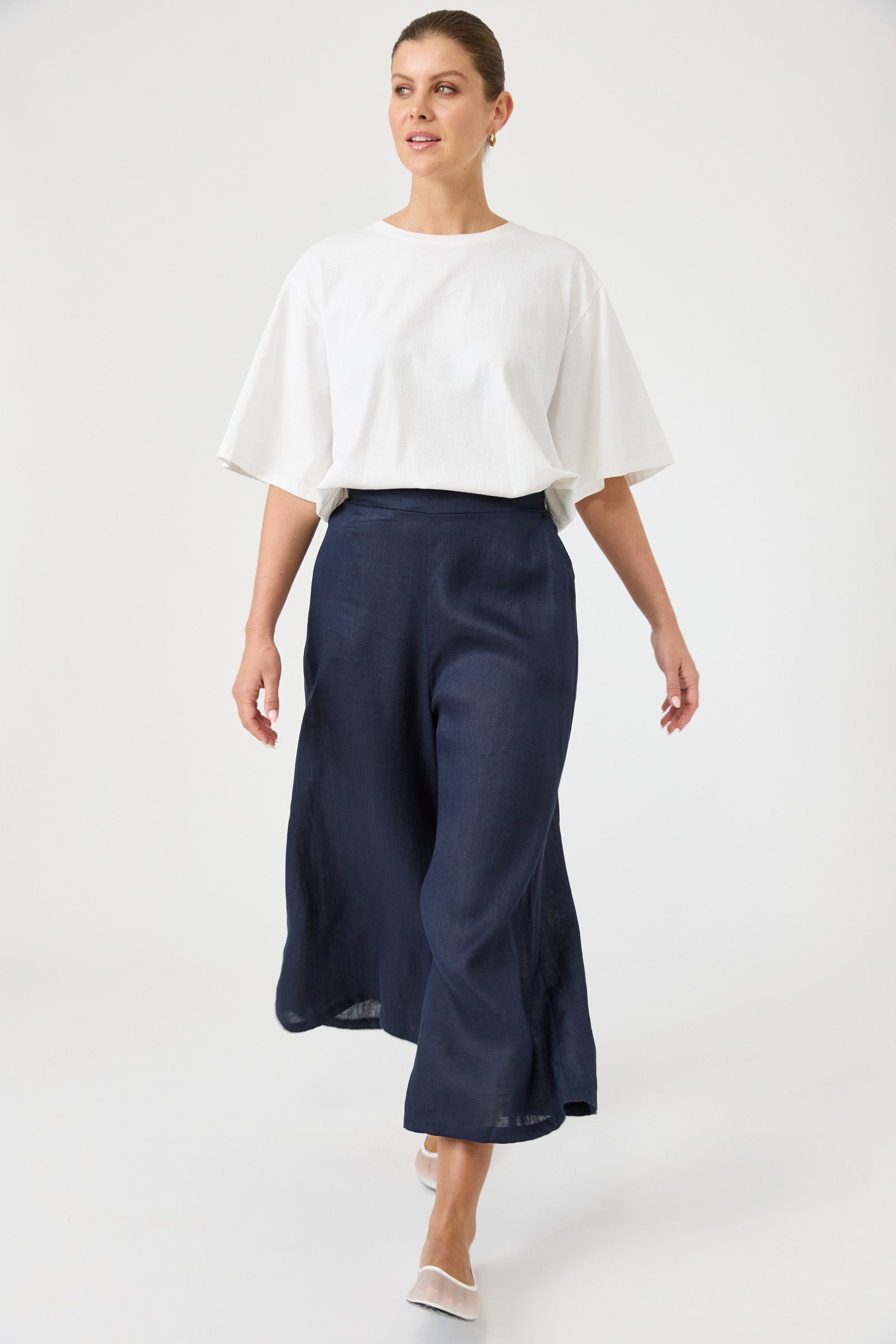 Crafted from 100% linen, this breathable style is an essential for warm-weather dressing. Designed with a flat front waistband and elasticated back for a flexible, flattering fit. Features a high rise fit, functional pockets, and generous volume through the leg for a breezy silhouette. Finished at a chic 7/8 length.