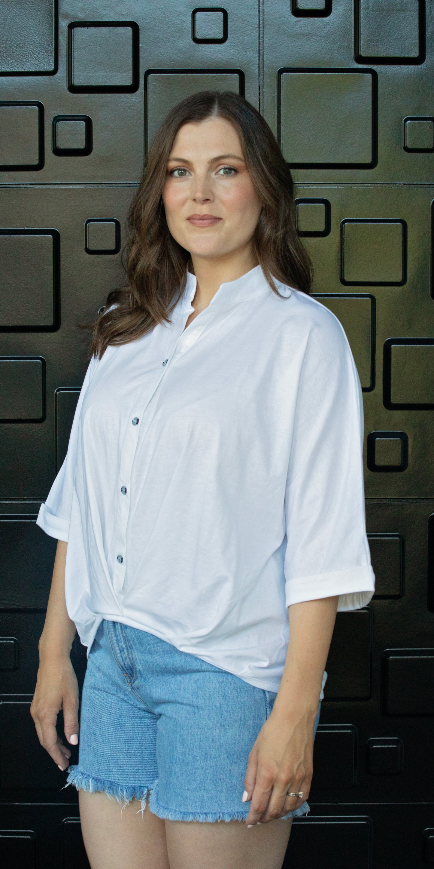 This white on black blouson top features a Madorin collar and a high-low hem, complemented by elbow-length sleeves and a blouson silhouette with a stitched crossover hemline. The unique black and white buttons provide a striking accent. Made from 175g Pima cotton with added stretch, it delivers superior comfort. Perfect for styling with wide-leg trousers, skirts, or shorts, it is an ideal choice for summer wardrobes.